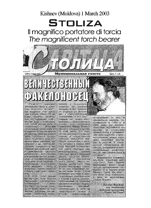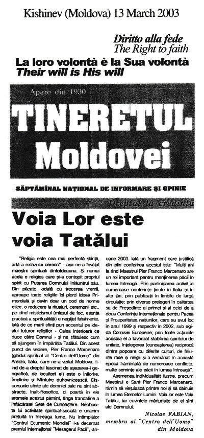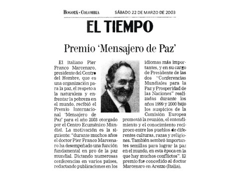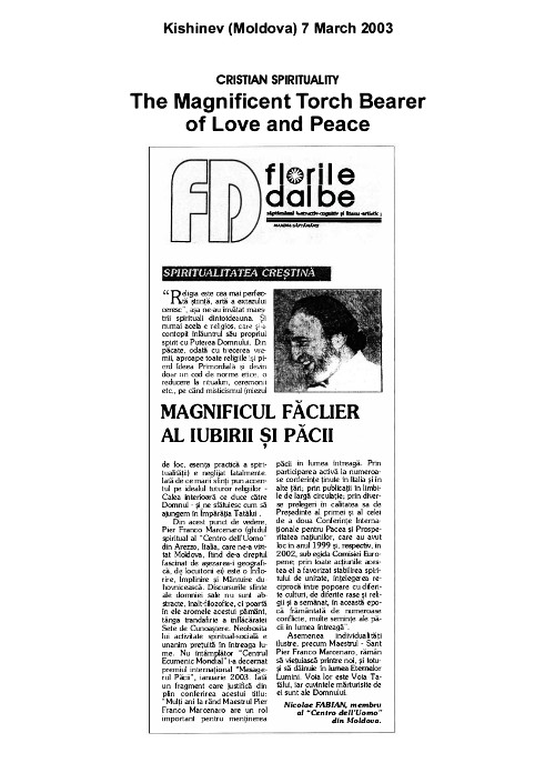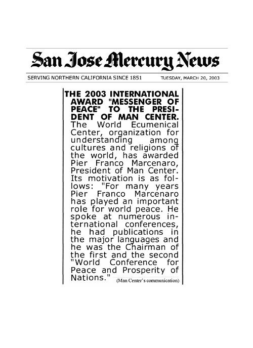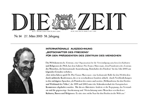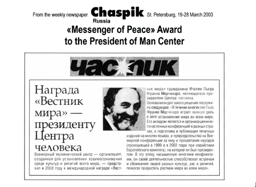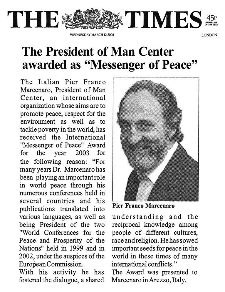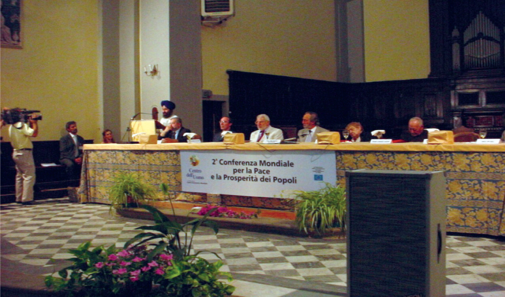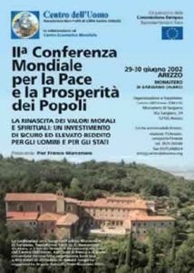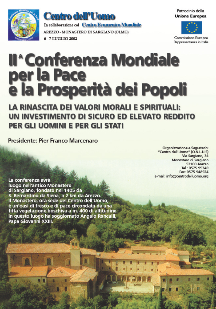 Pe 29 și 30 iunie 2002, a avut loc cea de-a doua Conferință Mondială pentru Pace și Prosperitatea Popoarelor, prezidată de domnul Pier Franco Marcenaro, în Mănăstirea istorică din Sargiano, în localitatea Arezzo (Italia). Conferinţa a fost organizată de Centrul Omului și Centrul Ecumenic Mondial (astăzi Centrului Interreligios Mondial) şi a fost sponsorizată de Comisia Europeană.